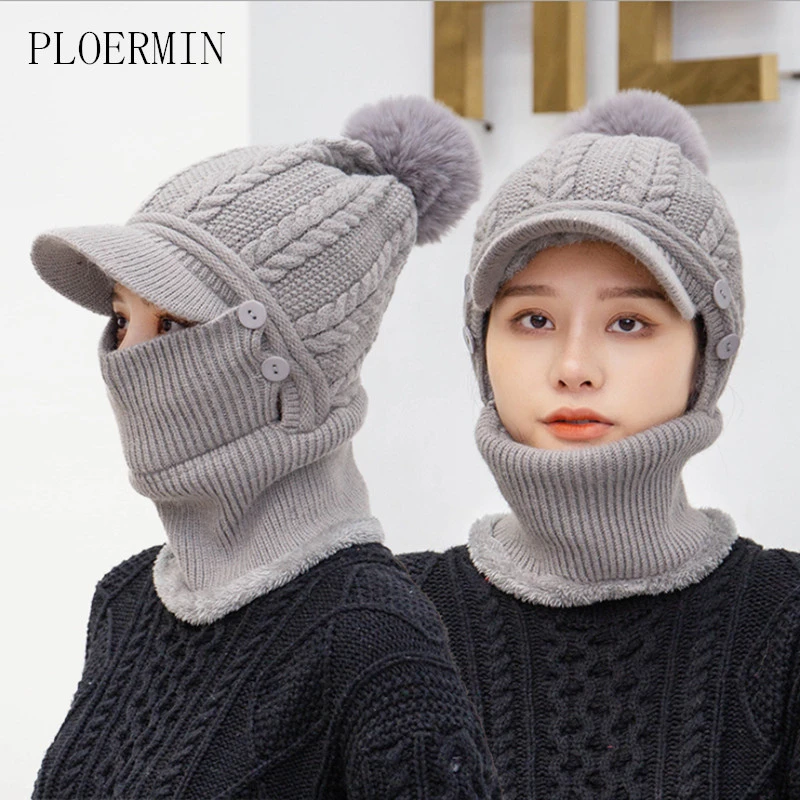 Gorros de invierno para mujer, bufanda con máscara 2 en 1, gorro tejido de lana, pompones, gorro de esquí cálido, forro de piel, protector para ciclismo|Las mujeres de punto y gorros| - AliExpress