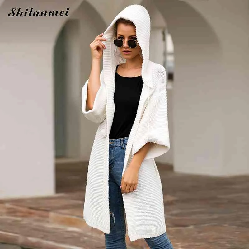 Cárdigan largo coreano para mujer, chaqueta con diseño de gorra siamesa, suéter, Chaqueta de punto holgada informal, capa superior blanca|Caquetas de punto| - AliExpress